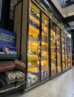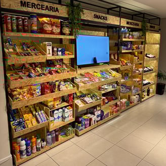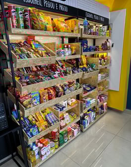Para locais com maior fluxo de pessoas ou necessidade de variedade de produtos. Ambientes mais amplos, com prateleiras duplas e circulação confortável.